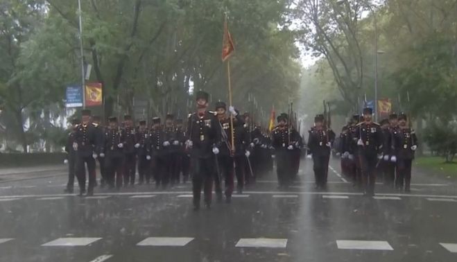 Las fuertes precipitaciones protagonizan este sábado 12 de octubre. El Día de la Hispanidad está pasado por agua. La lluvia cae con fuerza sobre las cabezas de más 4.000 integrantes de las Fuerzas Armadas y Fuerzas y Cuerpos de Seguridad del Estado durante el desfile. Sus pisadas en los charcos y sus uniformes empapados marcan este acto que está teniendo ciertas complicaciones.