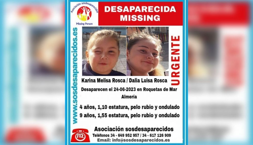 Desde la asociación SOS Desaparecidos han activado una alerta de búsqueda de las menores. Karina Melissa, de 4 años de edad, mide 1,10 metros y tiene, al igual que su hermana, el pelo rubio y ondulado. Dalia Luisa, de 9 años, mide 1,55 metros.