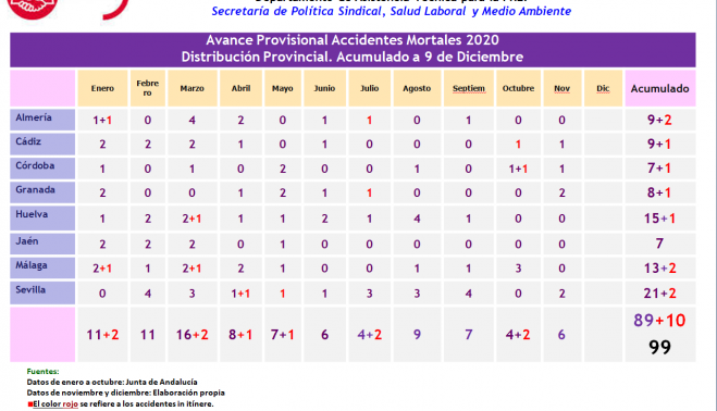 Andalucía registra en lo que va de año (a 9 de diciembre) un total de 99 accidentes de trabajo mortales —en 2019 hubo 104—, de los cuales 10 han sido in itínere —de camino o de vuelta al lugar de trabajo—, disminuyendo un 10,58% esta cifra (29 en 2019). Los datos, extraídos de El contador de la vergüenza puesto en marcha por UGT, quiere visibilizar el drama de la siniestralidad laboral. "En lo que llevamos de año en Andalucía llevamos 99 fallecidos en el entorno laboral. "Bajan los accidentes in itínere, evidentemente por la implantación del teletrabajo. Pero son cifras insostenibles, incluso teniendo en cuenta que ha habido tres meses de inactividad laboral que ha habido por la pandemia", recalca Juan Carlos Hidalgo, secretario de política sindical, salud laboral y medio ambiente del sindicato en Andalucía.