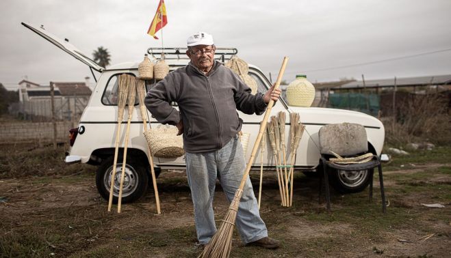 Delante de su inseparable Renault 4L queda una estampa que parece sacada de otra época. El tiempo se para en este pequeño espacio donde Antonio posa con sus creaciones para el reportaje. “¿Una foto y todo? ¿No me llevarán preso, no?”, pregunta con sorna. “Ten cuidado que se va a romper el cacharro ese”, añade, en referencia a la cámara de fotos. Luego se sienta en una vieja silla que saca de un cobertizo y se pone a zurcir un pequeño canasto en el que trabaja ahora. “Cuando pasen ocho o diez años y nos muramos los cuatro viejos que quedamos, a ver quién hace esto”, dice con pena.