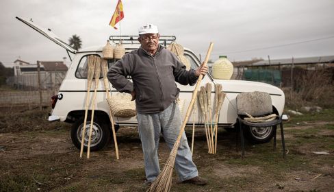 Mientras va contando su vida, el frío aprieta y Antonio se abriga junto a su vehículo, subiéndose el cuello de la sudadera. La lluvia está a punto de hacer acto de presencia y él de desmontar su improvisada exposición de artesanía, que volverá a montar al día siguiente, si el tiempo se lo permite. "Así estoy entretenido", insiste, y así pasa las mañanas mientras elabora cestas, canastos y escobas, ante la furtiva mirada de los conductores que giran la cabeza cuando pasan delante suya.