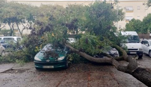 La barriada La Constancia de Jerez ha vivido un tremendo susto en la madrugada de este martes. Un gran árbol ha caído sobre varios coches que estaban aparcados en la plaza Pedro Romero y también ha afectado una zona donde antes había un banco que fue robado y que ahora cuenta solo con el hueco.