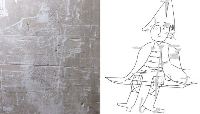 Mejías, en otro paso de su estudio, descubre unos interesantes grafitis en las paredes. Como si de la Cueva de Altamira se tratara, el estudioso calca y enseña cada uno de los dibujos que encontró perfectamente conservados en sus paredes. Entre ellos nos muestra “un individuo con barba con patillas de boca de hacha, un látigo o arma blanca en la mano. De finales del XVIII-mitad del XIX. También un músico tocando la trompa que lleva bicornio tocado con plumas del primer tercio del XIX”.