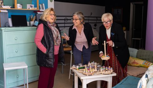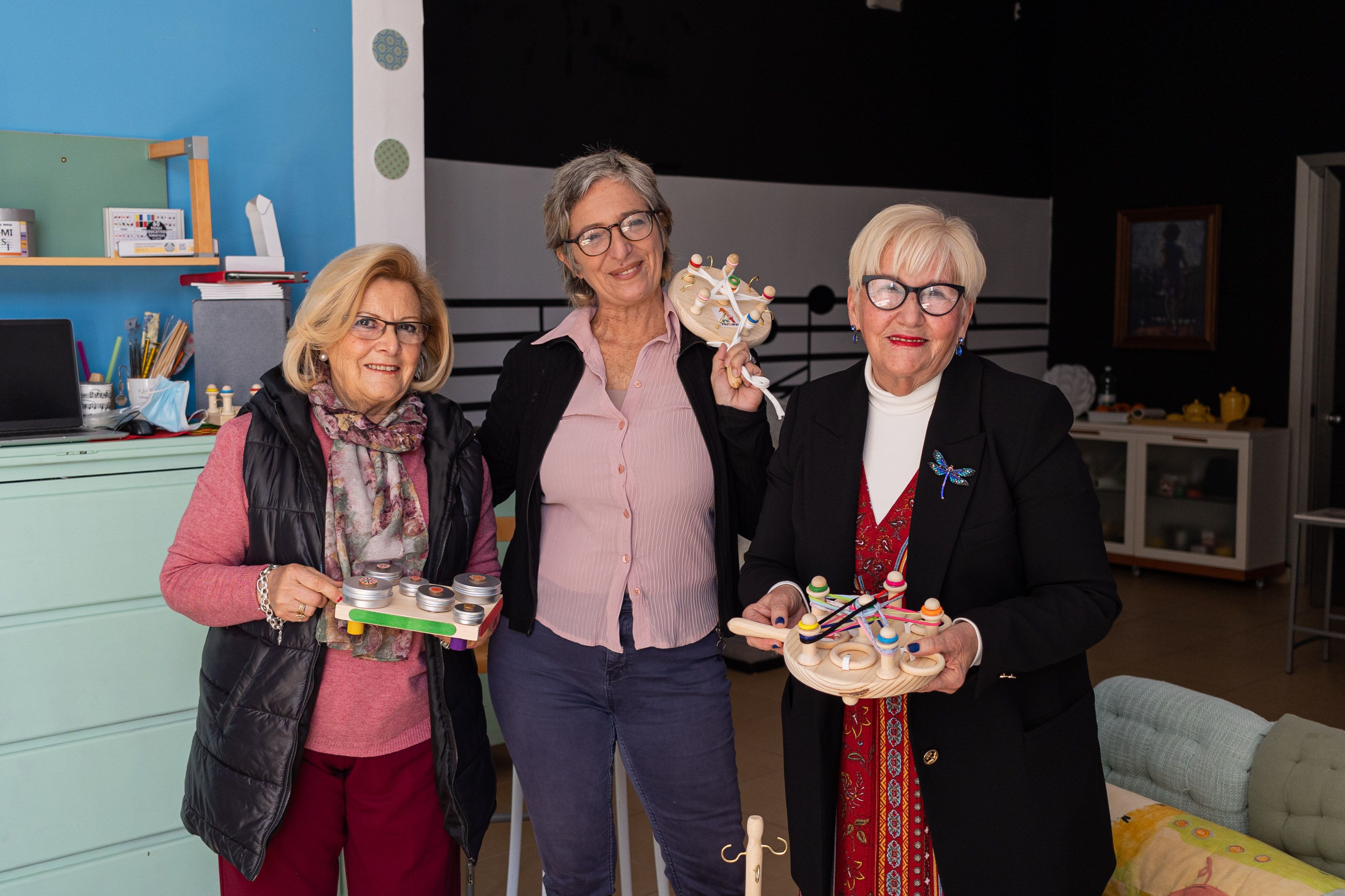 “Las argollas facilitan el movimiento vertical de la mano y los elásticos otorgan presión”, comenta. Pilar y Reme se concentran en enrollar los cordones y las gomas a su antojo realizando movimientos. Con la mente y el cuerpo entretenidas, se sumergen en los desafíos que Alicia les muestra.