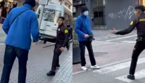 "Tira el cuchilo, tira el cuchillo", le pide el empleado, mientras que intenta golpear con la porra de seguridad la mano en la que el individuo porta el arma.