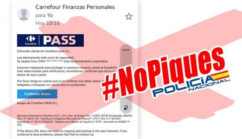 La Policía Nacional ha alertado de un nuevo caso de estafa por internet. En este caso, los ladrones se hacen pasar por el supermercado Carrefour para intentar conseguir tus datos bancarios. “¡#Phishing ataca de nuevo! No pinches ningún enlace si te llega este mail haciéndose pasar por #Carrefour”, escribía la Policía en redes sociales.