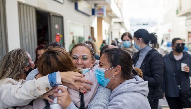Los gritos se escuchan desde antes de cruzar la esquina de la calle Baessipo. Allí, en los alrededores de la Administración de Loterías número 2 de Barbate, la alegría es una emoción que está muy presente. No es para menos. La Lotería de Navidad ha dejado 45 millones de euros en una localidad donde la tasa de paro hace tiempo que no baja del 40%. La alegría se refleja en la cara de un grupo de grupo de amigas que comparten décimo desde hace años y que brindan con champán. También en una familia, con varios miembros en paro, que no para de reír. En vecinos que pasan en coche, con dificultad por la cantidad de gente que abarrota la calle, mientras hacen sonar el claxon. O en una señora que se arranca con una pataíta, contagiada por la emoción, aunque ella no sea una de las agraciadas.