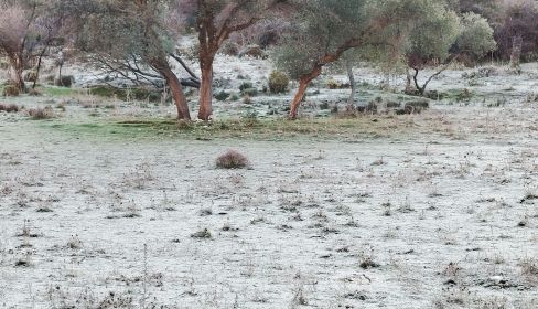 La ola de frío extremo se deja sentir en todo el territorio nacional. Los gélidos amaneceres de estos días están dejando finas capas de hielo en los parabrisas de los coches —hasta en la zona Sur de Jerez— y también bellas estampas de campos como si estuvieran nevados en la Sierra de Cádiz.