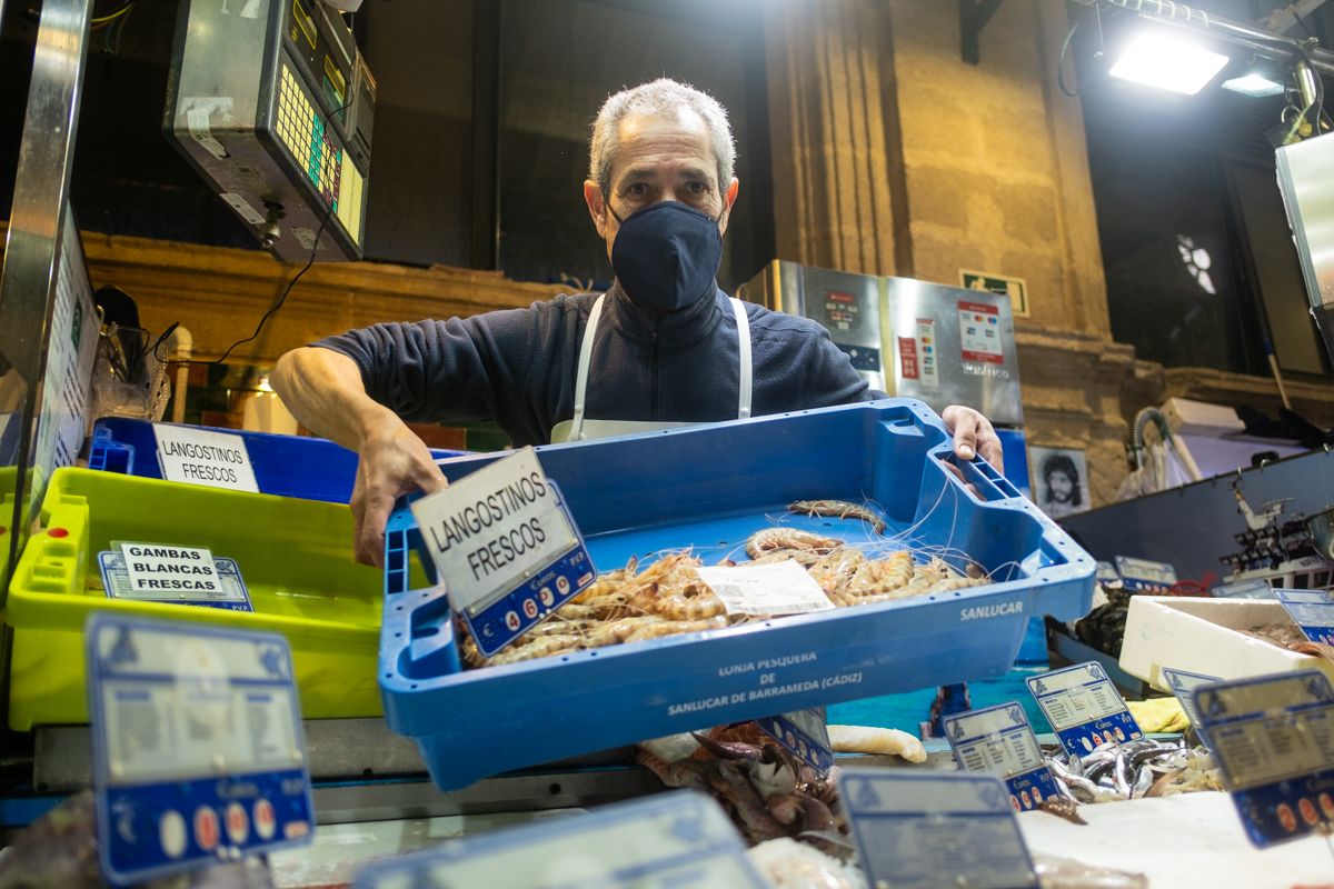 En su puesto no faltan propuestas. Empieza la retahíla: "Tengo mejillones, chirlas, coquinas de Huelva, almejas, doradas de varios tamaños, salmonete, rape, lubina, borriquete, acedías de Marruecos, de Sanlúcar, lenguado de la Bahía, lenguado fino, huevas de Cádiz, calamares y chocos de la Bahía, langostinos espectaculares de Sanlúcar, gambas buenísimas de Huelva… salmón al corte, langostinos de Castellón, bacalao, boquerón de Barbate, galeras de coral…”. Se vuelve hacia una cámara y dice: “También ahí hay carabineros, bocas, patas, colas de gambón, gambones enteros”. Leemos en la puerta de esa nevera: “Hay bogavantes por encargo”. “Sí, ahora mismo es lo más caro que vendo. “Ya han pegado el subidón y están entre 55 y 60 euros el kilo de coste”, reconoce.