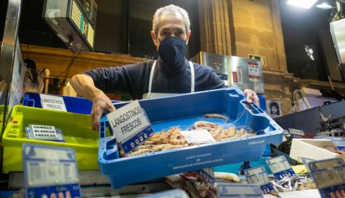Ahora envía su oferta por WhatsApp a sus clientela habitual —“conozco al 90% de los que vienen a comprarme”— y también sirve a domicilio a los más fieles que ahora no pueden salir “o no quieren arriesgarse”. La Plaza es un reflejo de lo que hay fuera. Las sociedades son sus mercados. Entre el murmullo de la nave del pescado pasa la vida. Bogavantes y acedías de Marruecos. Todos los precios los tiene el número 4 de esa nave de un mercado que ha cumplido 135 años y es uno de los clásicos de Andalucía.