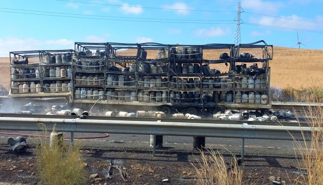 El incendio en un camión con bombonas en la carretera A-381 (Jerez-Los Barrios) a la altura del término municipal de Alcalá de los Gazules, en sentido Algeciras, ha mantenido cortada la vía durante buena parte de la mañana de este viernes, aunque ya se encuentra abierta de nuevo al tráfico.