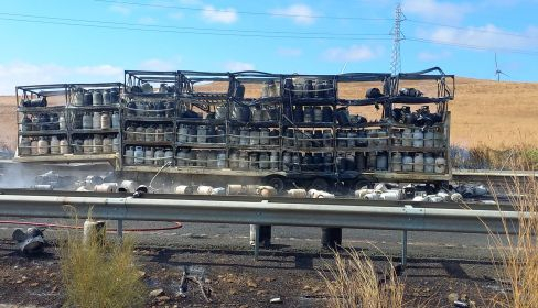 Bomberos del Consorcio Provincial del parque de Medina, con apoyo del parque de Benalup-Casas Viejas, han intervenido en el siniestro. El camión transportaba más de 1.000 botellas de propano.