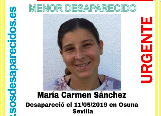 La Guardia Civil de Sevilla trabaja en la búsqueda de María Carmen Sánchez, menor de 17 años de edad, desaparecida en la localidad sevillana de Osuna, desde el pasado 11 de mayo, día en el que se produjo el hecho.