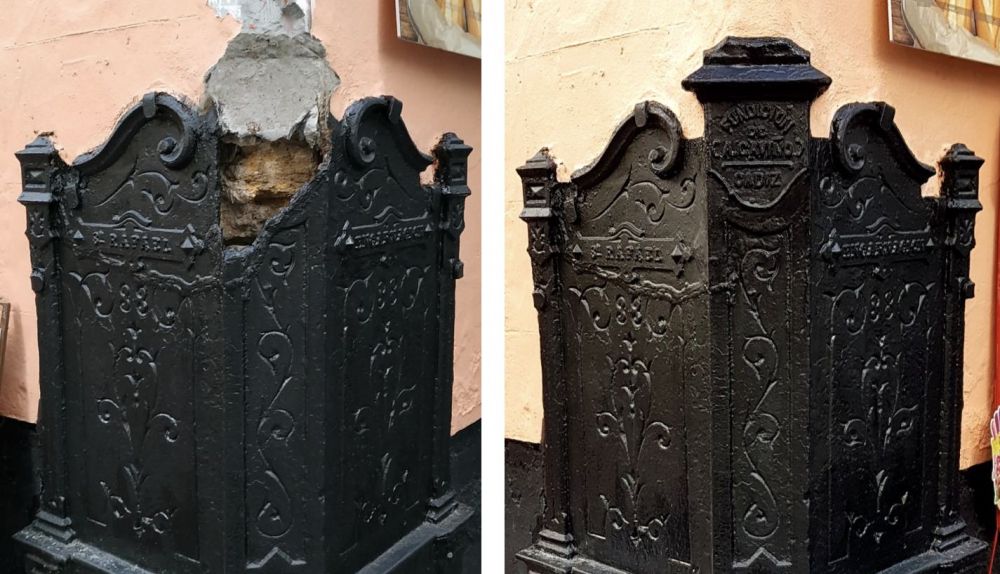 La campaña de restauración de guardacantones impulsada por la Delegación Municipal de Patrimonio Histórico del Ayuntamiento de Cádiz ha permitido, hasta el momento, la restauración de 170 piezas históricas desde que el pasado mes de abril se iniciara en colaboración con la Delegación Municipal de Mantenimiento Urbano.