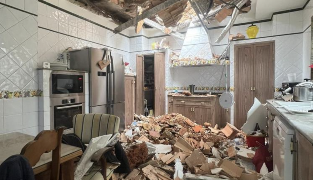 En la inspección se ha observado la rotura de dos vigas de castilla, dando acceso a la cocina, donde se amontonan los escombros del derrumbe. Igualmente, han inspeccionado el sotano, por si ha habido alguna grieta, no encontrando ninguna.