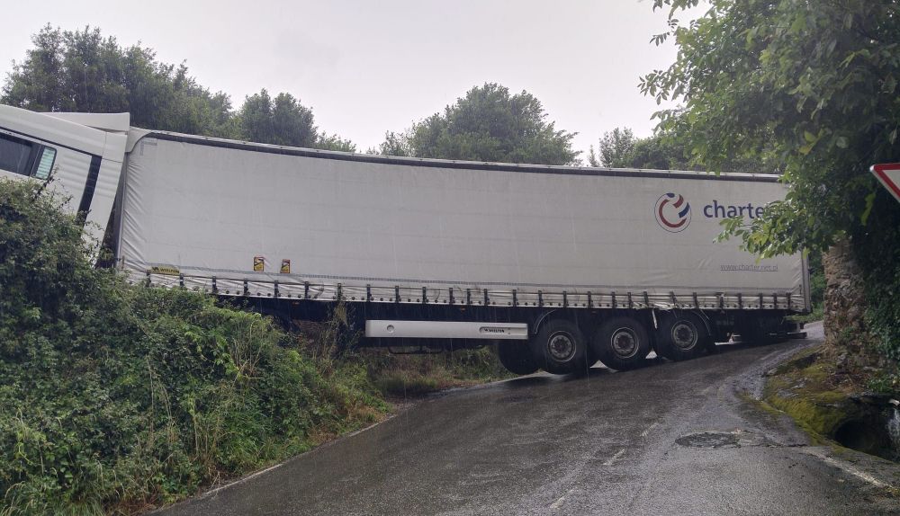 A veces la tecnología se equivoca y puede jugarnos malas pasadas. Es el caso de este camionero de la empresa 'Charter' que por seguir ciegamente las indicaciones del GPS se quedó atrapado en la carretera de Porceyo en el camino de Sotiello, Asturias.
