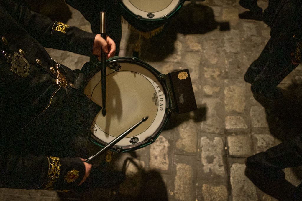 Banda de Cornetas y Tambores del Santísimo Cristo de la Caridad, detrás del paso de Misterio de La Soledad. FOTO: MANU GARCÍA.