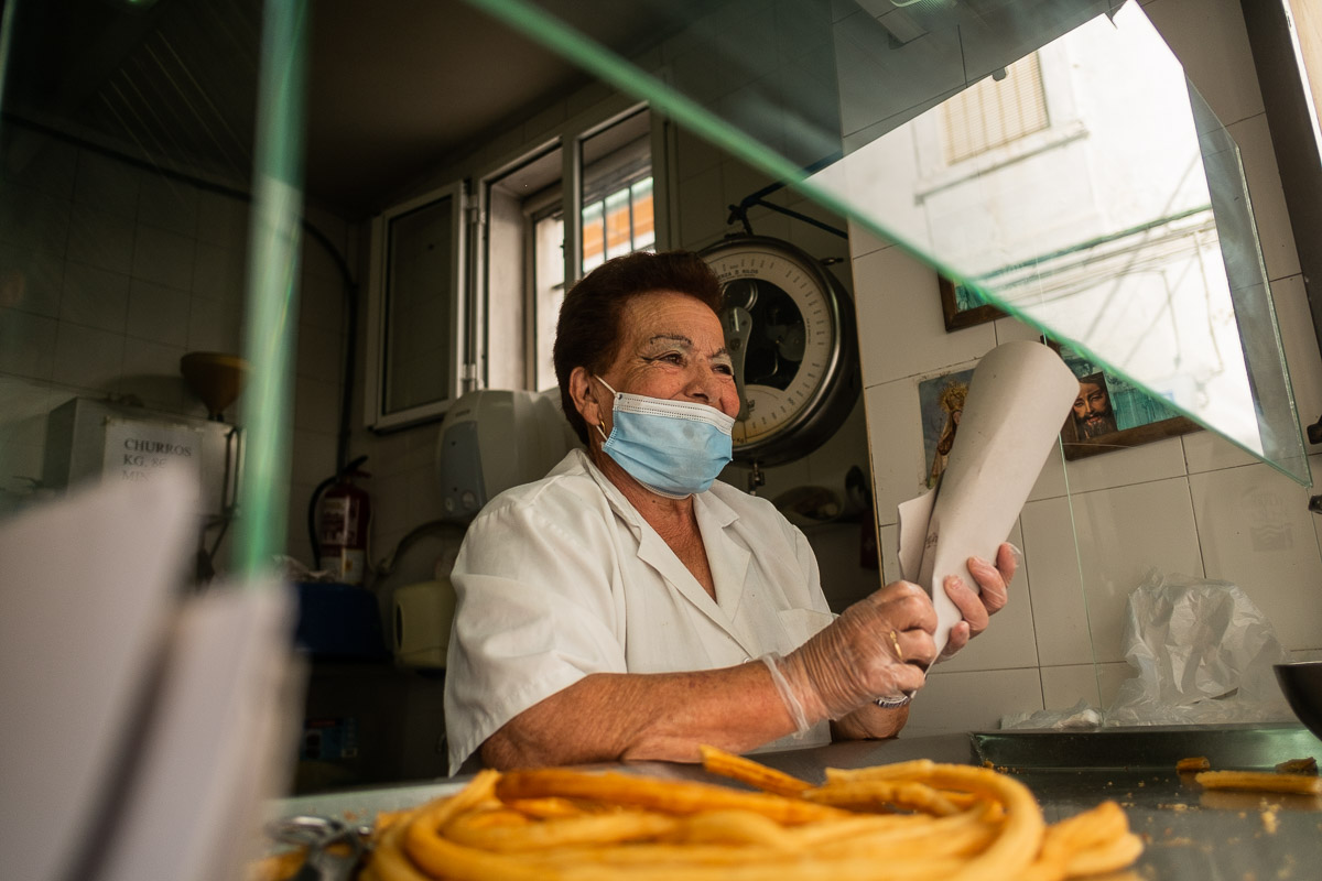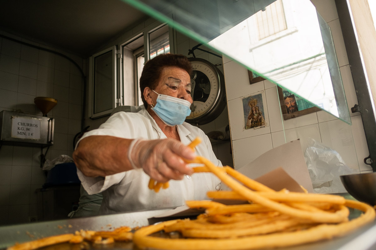 A sus 77 años, está todos los días “venga que venga” y charla con todo el mundo que se acerca a su ventanilla, que ahora presenta una pantalla protectora como medida de prevención frente al covid. Dicharachera y con mucho arte, la portuense ha vendido churros a varias generaciones. “Esta es el primer día que viene a verme”, bromea Charo al ver a una de sus clientas habituales que lleva degustando sus churros desde que era una niña. “Fíjate si hace tiempo que viene ella que ya viene con sus nietos y todo”, exclama la churrera.