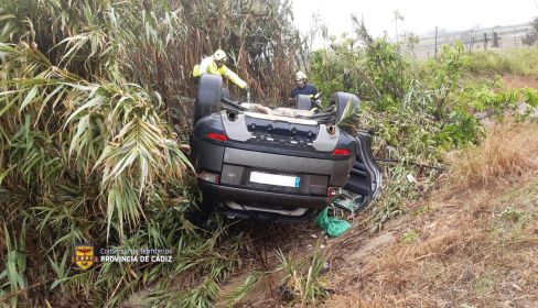 Bomberos del Consorcio de la Provincia de Cádiz de Chiclana han intervenido en un accidente de tráfico en el kilómetro siete en dirección Cádiz de la A-48 (Cádiz-Barcelona). Habían recibido un aviso a las 11:45 de este viernes alertando de un vehículo salido de la vía y que había volcado, con una persona atrapada en su interior.