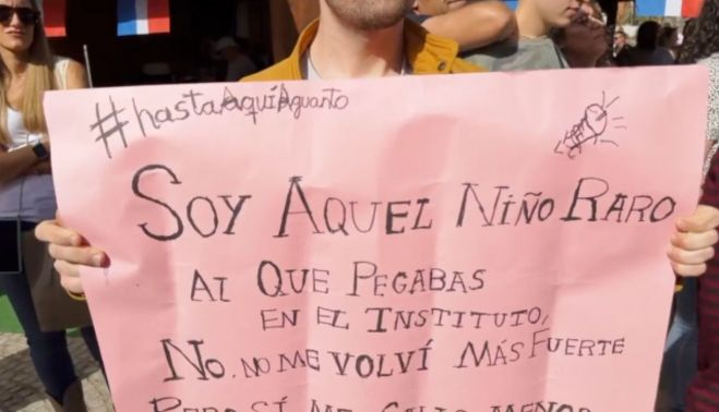 "Soy aquel niño raro al que pegabas en el instituto. No me volví más fuerte, pero sí me callo menos", se puede leer en una pancarta de un joven con TEA que denuncia en el vídeo que sufrió acoso escolar en Primaria y en la ESO. "No hacían nada más que insultarme, apartarme de clase y pegarme".