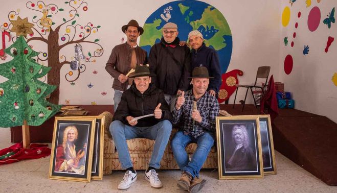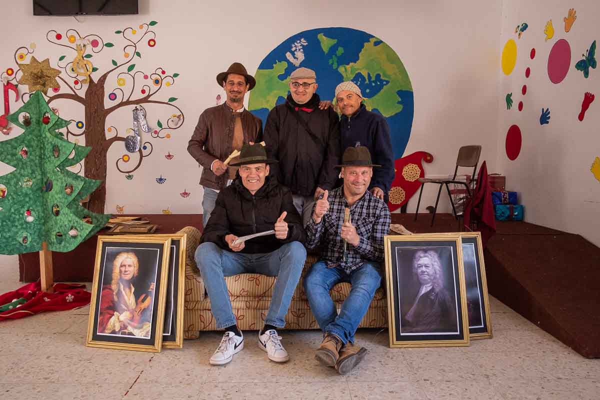 Merda, merda, mucha merda, se llama un cuarteto en el que sus componentes aparecen caracterizados como miembros de una orquesta barroca que chapurrea francés con mucho acento gaditano. “Si piensas que soy el tonto del pueblo, estás un poco anticuado, esto es una ciudad y no un pueblo… y más tontos que yo los hay a puñados”, reivindican durante el repertorio. En mitad de uno de sus ensayos reciben a lavozdelsur.es, que visita el espacio que les cede Afanas de El Puerto y Bahía, en el que llevan años dando forma a representaciones teatrales del grupo llamado Diversamente Diverso, que forman miembros de la asociación,