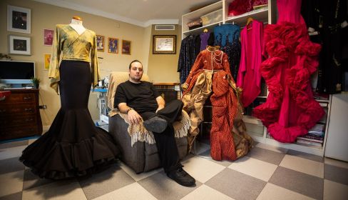 Esta joven promesa de la moda apunta alto. No solo ha confeccionado trajes de flamenca o de fiesta para su madre, sino también pone todo su cariño en otros proyectos que él mismo se ha ido buscando. Así, ha creado diseños para la cantante malagueña Marta Sango, que fue concursante de OT y en el Benidorm Fest, o para Peter Princesa Arcoíris, artista polifacético que se convirtió en el primer niño Drag Queen de España. El modisto enseña un traje que Peter llevó en una de sus actuaciones en Tierra de talento, en Canal Sur, donde consiguió un efecto visual. El vestido se quedaba estático en el escenario gracias a una estructura. “También tengo otros trajes pendientes", comenta.