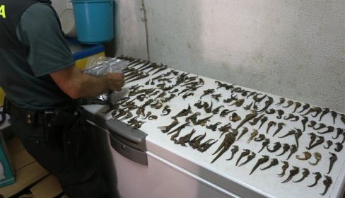 Los investigados almacenaban, según ha informado el Instituto Armado mediante una nota, en la trastienda de un restaurante de comida asiática mas de 340 kilos de pepinos de mar (Holoturias) y 300 caballitos de mar, todo ello ya deshidratado, por lo que habría que multiplicar por diez el peso de las capturas obtenidas de manera ilícita y tenían cajas preparadas para su envío a distintos establecimientos de España e Italia.