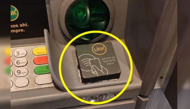 En redes sociales y en mensajes a través de WhatsApp se está difundiendo mucho esta estafa. El usuario que llega al cajero puede ser saqueado fácilmente sin que se percate de ello si no se da cuenta de la presencia del dispositivo que se encarga de copiar las bandas magnéticas.
