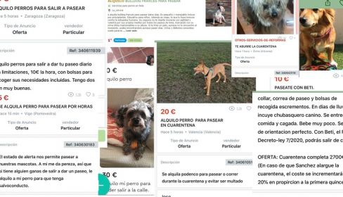 Varias plataformas de compraventa tienen anuncios de alquiler de perros para la cuarentena. "Dado que salir con nuestros perros a la calle para poder cubrir sus necesidades sí está permitido, algunas personas ofrecen el alquiler de sus perros por horas para poder saltarse la obligación de permanecer en casa, salvo causa de fuerza mayor", apuntan desde Pacma, que denuncia estos hechos ante la Policía Nacional.
