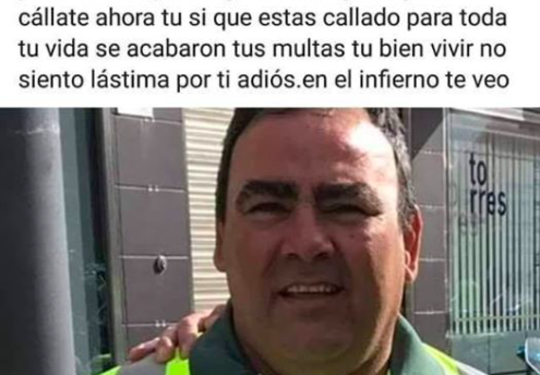 "Cuando me puso la multa por la cara, bien que se puso en medo de la carretera en plan agresivo para que me parara, te hablo de 2012 imagínate, normal que un día te tenía que tocar, te creías Hulk? No siento lástima por ti, en los juzgados no la sentiste cuando mi madre te dijo que me perdonaras que era joven loco y le dijiste cállate. Ahora tú sí que estás callado para toda tu vida, se acabaron tus multas. Adiós, en el infierno te veo", reza la publicación.