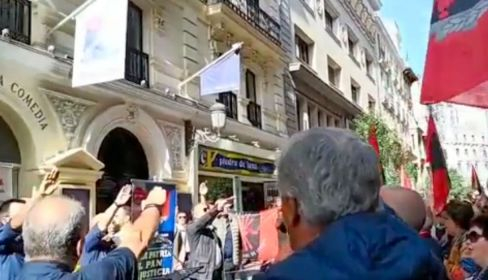 Nueve días después de la entrada en vigor de la Ley de Memoria Democrática, el desafío a la ley es claro por parte de los falangistas reunidos a las puertas del Teatro de la Comedia, lugar donde el hijo del dictador pronunció en 1933 el mitín fundacional.