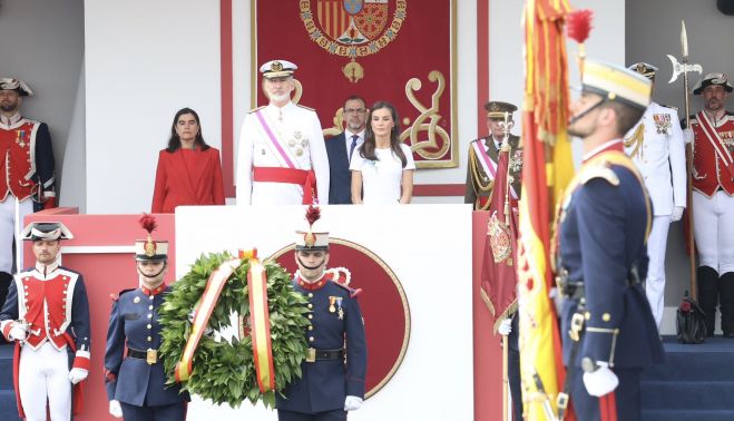 Tras la llegada real, se izó la bandera nacional y se rindió homenaje a los que dieron su vida por España. Uno de los momentos más emotivos fue el salto paracaidista de la patrulla PAPEA, con gran precisión desde 1.000 metros de altura. El cabo Iván García-Estrada aterrizó portando la bandera del X aniversario de la proclamación del rey, seguido del cabo 1.º Francisco Vico con una bandera de España de 24 metros cuadrados.