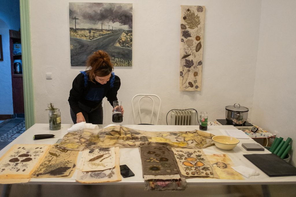 En una de las mesas que utilizan para realizar las labores de patronaje, Consuelo muestra uno de sus libros de referencia, con el que afirma que empezó todo. “Me enamoré de él”, dice sosteniéndolo entre sus manos. La obra, que habla de técnicas sobre tinturas y coloraciones naturales, le dio la base para investigar y realizar las “recetas” con plantas. Tras comenzar haciendo baños de tintura, descubrió la estampación. Mediante procesos de presión y de calor, “flipó” con lo que podía llegar a crear. “El libro se me quedó corto y busqué cursos; poco después monté mi tallercito y como yo no sé coser, se me ocurrió llamar a Yolanda”, explica dirigiéndose hacia ella. Un día se encontraron por la calle y le contó el proyecto. Así nació Vestihio.