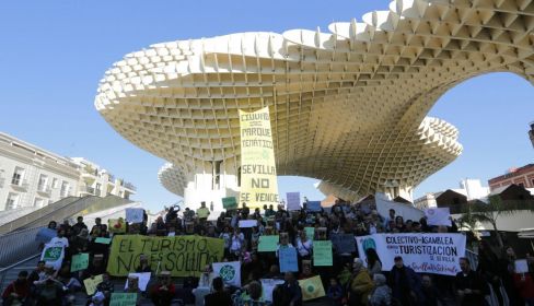 "La ciudad no es un parque temático. Sevilla no se vende". Así rezaba la pancarta de 4 x 15 m² que Ecologistas en Acción ha descolgado del mirador Setas de Sevilla y con la que ha denunciado el proceso de turistificación que se sufre, tanto en la ciudad hispalense como en otros lugares del territorio español, según la organización.