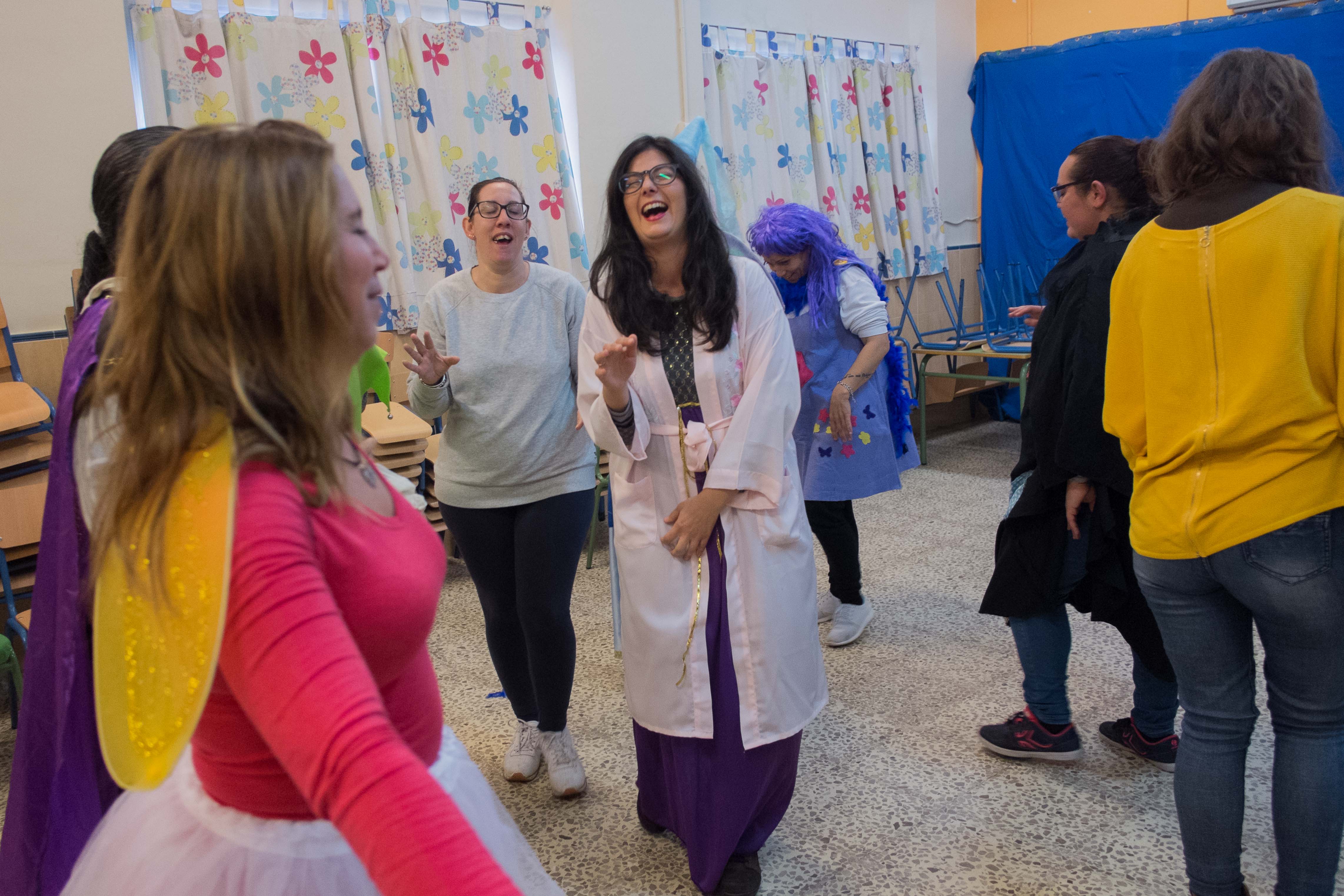 "Me hubiera gustado haber visto a un hombre vestido de hada, por ejemplo", destaca Rocío Armosín, que interpreta al "hada mala" de la historieta. "Lo que se trata es que el hombre se incorpore en los espacios femeninos. Compartir el espacio, eso es lo queremos enseñarle a los niños", agrega. Si bien los padres también estaban llamados a participar en la pieza teatral, "la mayoría trabaja" con turnos partidos o a jornada completa. ¿Y vosotras no trabajáis? "Digo, trabajamos 24 horas en casa y en el cole, sin nómina", responde con arte, y de manera ácida, Marta Palazón, la narradora del cuento y presidenta de la AMPA del CEIP Federico Mayo. Según las últimas cifras de la Encuesta de Participación Activa (EPA) el 75% de los contratos a tiempo parcial están firmados por mujeres, y, como recoge eldiario.es, en España 400.000 mujeres trabajan a jornada parcial debido a las obligaciones familiares, una tarea que siguen soportando las mujeres como si fuese una labor innata.