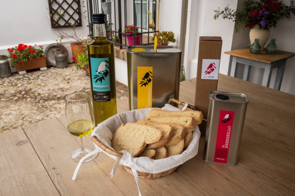 Todo está lleno de flores, y en el campo aparecen todo tipo de plantas. Caminando entre los olivos, enseña también los acebuches, el olivo salvaje con el que hace unos años hicieron un experimento de aceite de acebuchina que causó muy buenas sensaciones. Sin embargo, la producción del aceite El Herrerillo se basa exclusivamente en olivos de variedad picual o marteña. Su aceite monovarietal destaca por sus atributos positivos amargos y picantes. Y no es fácil conseguir la calidad que la familia logra. Los fuertes vientos que azotan a este área situada entre la Campiña de Jerez y La Janda, sumado a las condiciones metereológicas, la humedad y fertilidad del terreno, le dan un carácter muy especial al producto.