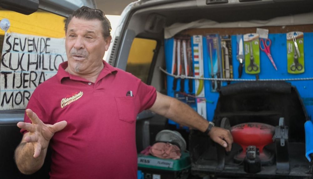 “Afilador Morayto” pone, escrito con tiza, en una pequeña pizarra negra que coloca encima de la furgoneta. Al lado, ondea una pequeña bandera de España. El maletero del vehículo hace tiempo que dejó de ejercer como tal. De unos alambres dispuestos sobre una chapa azul cuelgan cuchillos de cocina, navajas y tijeras. El hueco que queda en la parte trasera lo ocupan un pequeño motor de gasolina y una rueda con la que afila todo lo que le pongan por delante.Joaquín El Morao, como lo conocen en Jerez, lleva 47 años ejerciendo una profesión que está en peligro de extinción y que ha aprendido a base de “muchos cogotazos”. Él no ha conocido otra cosa desde que su abuelo le inculcara un veneno que lleva corriendo por sus venas desde muy joven. José Gálvez, que es como se llamaba, tenía una fragua donde el pequeño Joaquín también empezó a canturrear. “Él me enseñó”, dice, “me apuntaba la letra y yo cantaba”.