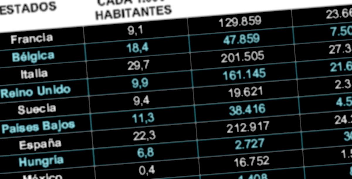 En concreto, España es el país número 17 de una lista de 36. Para dimensionarlo, se ofrecen los datos porcentualmente. Lidera el ranking la pequeña Islandia, con pruebas al 13,5% de su población de algo más de 350.000 personas (la suma de Jerez, Cádiz y Puerto Real). Le sigue Luxemburgo, con el 6,4%. El tercer y cuarto país, Lituania y Estonia, se sitúan en el 3,7%. Noruega, Israel, Italiza y Suiza, alrededor del 3%. En el grupo del 2% está España. Con Dinamarca (2,7%), Austria, Letonia, Nueva Zelanda y Alemania (2,5), y Eslovenia, Irlanda, Portugal y España en cifras similares (del 2,4 al 2,23% de España). La media de la OCDE es del 2,31%.