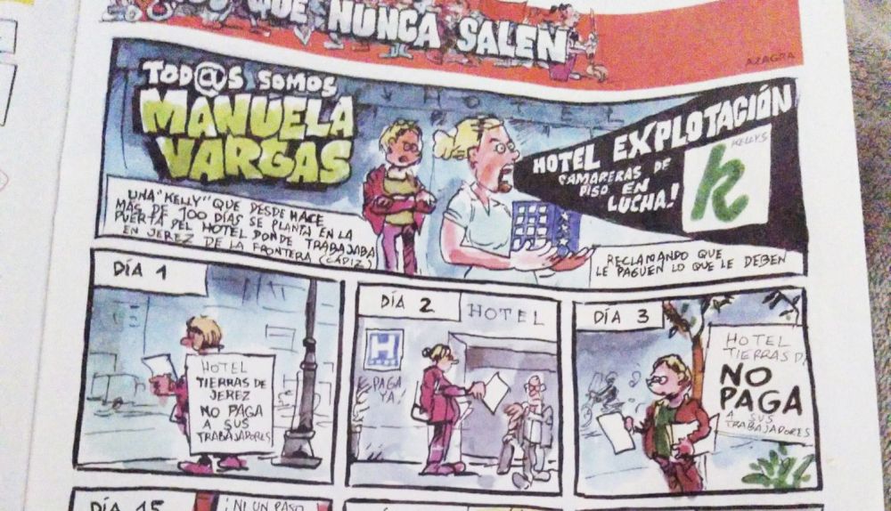 Desde varios desayunos hasta una Zambomba, pasando por un villancico con letra propia. Por su constancia y su originalidad, la protesta de Manuela Vargas ha recorrido toda España. Es por ello que la batalla laboral que pelea esta jerezana ha llegado a una de las páginas del semanario de humor satírico, de la mano de los dibujantes Azagra y Revuelta. Sin olvidar que detrás de Manuela también están las más de 15.000 camareras de piso que trabajan en el territorio nacional.