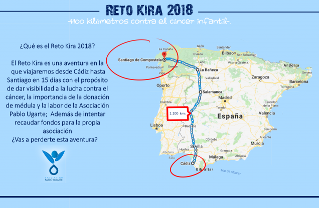 “Nuevo itinerario, nuevo acompañante y nuevos medios de transporte”, apunta la descripción del Reto Kira en migranodearena.org, una plataforma a través de la que pretenden recaudar unos 3.000 euros, donde da detalles sobre el itinerario previsto entre El Puerto y Santiago de Compostela. “El objetivo será completar la ruta dando difusión a la importancia de la investigación de los diferentes tipos de cáncer, la responsabilidad y lo esencial de donar médula y, por supuesto, recaudar fondos para la asociación Pablo Ugarte”, señalan.