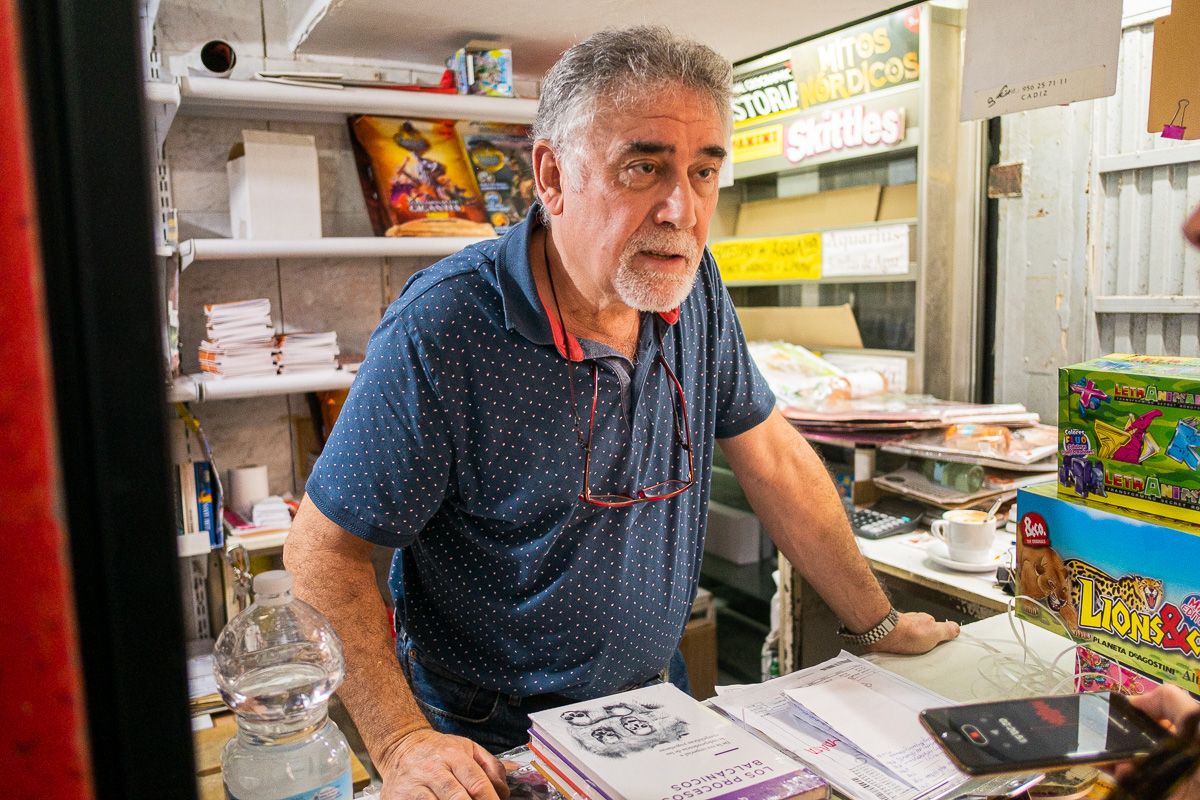 Naranjo atiende a lavozdelsur.es, mientras desmonta las estanterías de su emblemático quiosco. FOTO: MANU GARCÍA