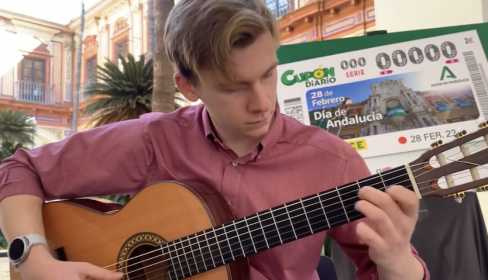 La entidad dedica su cupón del 28 de febrero a Andalucía, imprimiendo en cinco millones de boletos la fachada y balcón principal del Palacio de San Telmo con la bandera andaluza. Durante la presentación del cupón, Roman interpretó el himno a guitarra.
