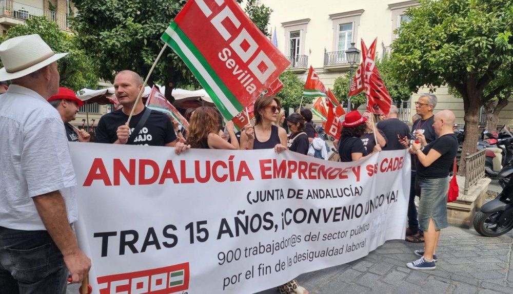 Delegadas y delegados de CCOO en Andalucía Emprende, Fundación Pública Andaluza, se han vuelto a movilizar este martes, procedentes de las ocho provincias, en la Delegación del Gobierno de la Junta de Andalucía en Sevilla, convocados por el sindicato, para reivindicar, una vez más, la necesidad de llegar a un acuerdo que ratifique un nuevo convenio colectivo, en el que se homologuen las condiciones laborales de toda plantilla, tras 16 años de infructuosas negociaciones con la Administración andaluza, lo que ha motivado y motiva serias desigualdades con el resto de plantillas de la Junta de Andalucía, como un salario sumamente inferior, a pesar de realizar funciones similares con las mismas categorías laborales.