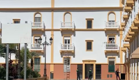 Miembros del Parque de Bomberos y agentes de la Guardia Civil de Chiclana han intervenido a mediodía de este lunes tras ser alertados por vecinos de la Plaza Domingo Bohórquez, en la calle Gustavo Adolfo Bécquer. El aviso a los cuerpos de seguridad se ha producido tras detectar un fuerte olor que salía de un piso ubicado en uno de los bloques de dicha plaza.