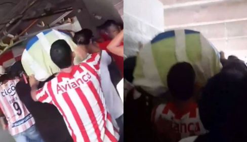 Grupo de hinchas del Junior entró a la fuerza al estadio con el féretro de un amigo que falleció en un accidente de tránsito pic.twitter.com/yWkuRasNRC