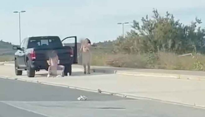Junto a una camioneta de color negra, una de las mujeres practicaba el onanismo con un juguete sexual, mientras que su compañera de aventura la estaba grabando. Las dos estaban completamente desnudas.