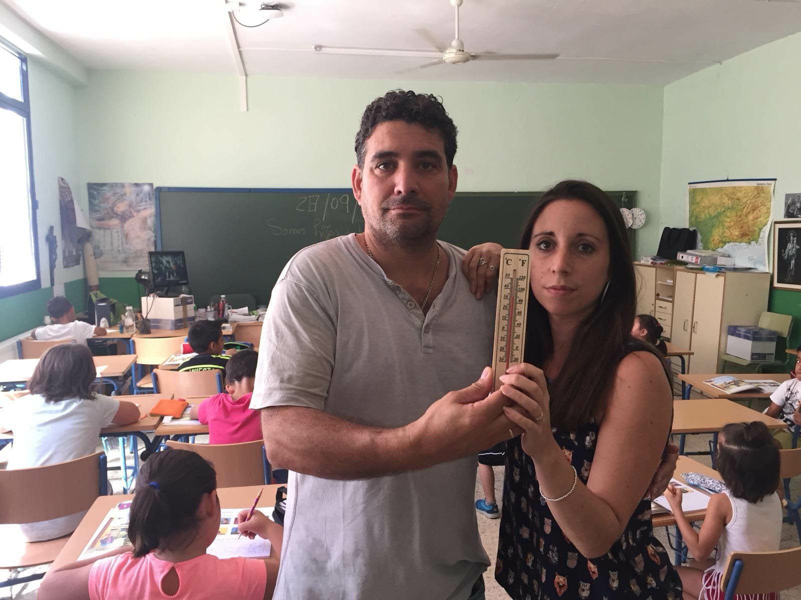 Unos docentes sevillanos señalando la temperatura en su aula: más de 30 grados. FOTO: ESCUELAS DE CALOR