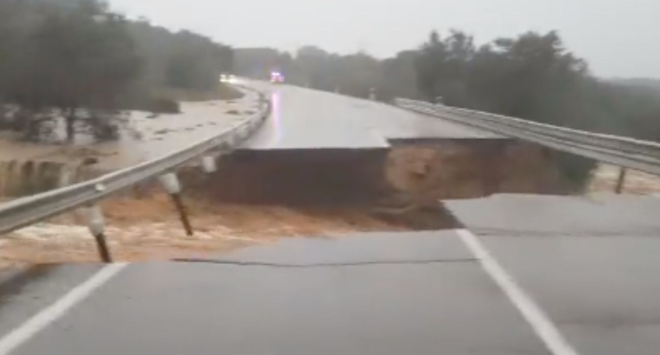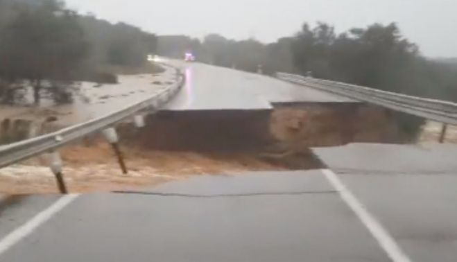 Las fuertes lluvias de la borrasca Efraín se han tragado, literalmente, un trozo de la carretera N-523 que une Cáceres con Badajoz. Este suceso ha provocado el cierre del tráfico debido a los numerosos saltos de agua existentes en el vial, en un tramo corresponde a la unión entre Puebla de Obando y Roca de la Sierra.