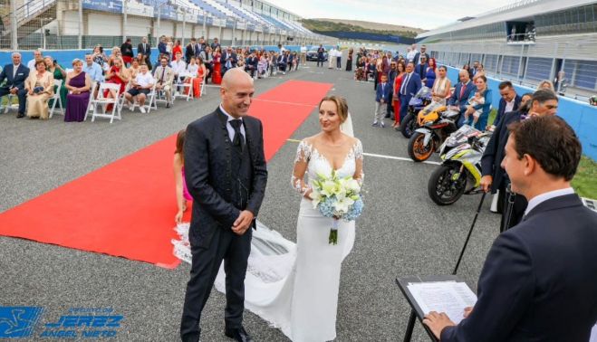 El Circuito Ángel Nieto de Jerez, protagonista en numerosas competiciones, ha sido en esta ocasión el testigo del espectacular enlace matrimonial entre Jorge y Kristina, una pareja de aficionados al mundo del motor que eligió la recta de salida del trazado jerezano para celebrar su boda.