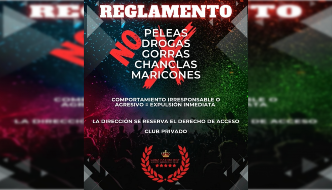 Casa Fátima Ino es el nombre de una sala que se autodenomina un club marroquí de lujo. En sus redes sociales ha publicado las referidas normas: "No peleas, no drogas, no gorras, no chanclas y no maricones".